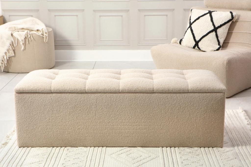 Decorative storage Ottomans are comfortable and do not need junk in them. On the outside, they appear like fashionable seats. From the outside, they look like stylish seating. Inside, they keep blankets, cushions, books, or seasonal décor.