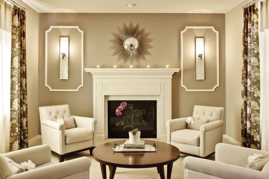 Floor lamps & lighting are tall, movable lighting options that fill empty corners and provide soft ambient light. They are placed comfortably next to the sofas or armchairs when reading.