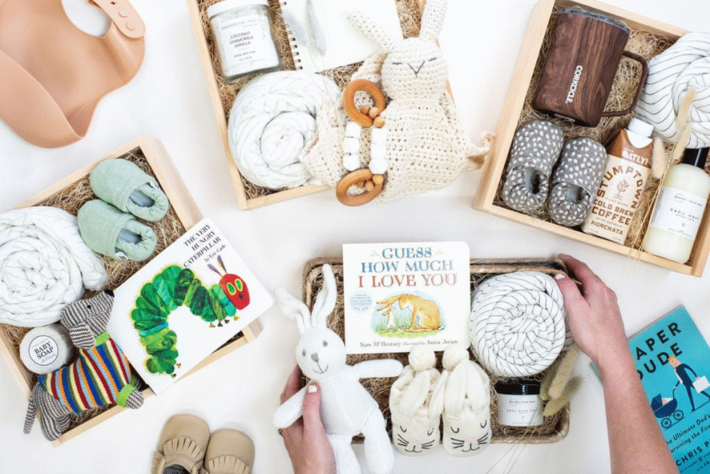 - Luxury new parents gift box—Sometimes the best things in the world are delivered as a gift box. A styled box may contain self-care items, baby supplies, and items that are sentimental.