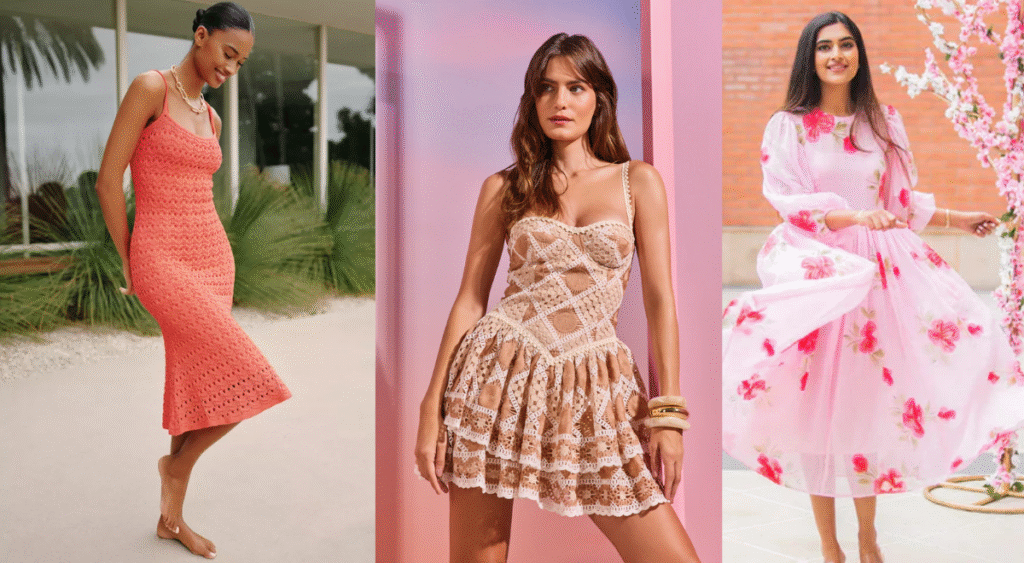 Crochet & textured clothes convey a tender, handcrafted sense that suits, certainly, the mood of spring. Pieces like the bossa crochet mini dress, natural crochet dress, and coral crochet cutout midi dress are designed to provide breathability while including a subtle, visible element to the outfit.